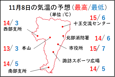 8日 最高気温15℃(-3℃) 最低気温 7℃(-3℃)