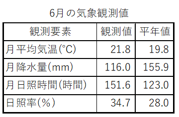 月平均気温は21.8℃とかなり高く、6月として高い方からの記録1位タイとなりました。また最高気温の平均も最も高くなりました。月合計日照時間は、151.6時間と平年の123%と多くなり、月合計降水量は116.0ミリと平年の74%と少なくなりました。