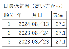 月平均気温は27.6℃とかなり高く、8月として高い方からの記録2位となりました。また、8月13日の最低気温は27.2℃とこれまでで最も高くなりました。