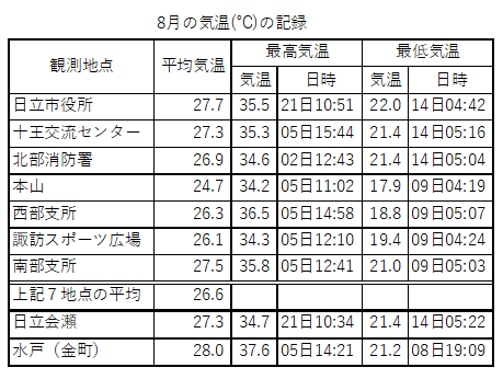 8月の日立市内の気温の観測結果を比較すると、平均気温は日立市役所が最も高くなっています。市内7地点の平均気温は26.6℃で、水戸の月平均気温28.0℃より低くなりました。