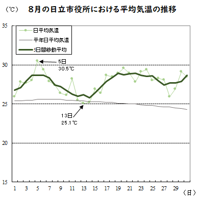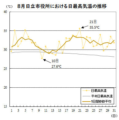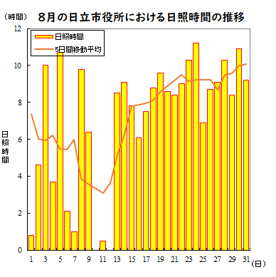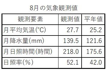 8月は、高気圧に覆われる時と前線が南下してくる時が周期的にあり、気温が高く、大気の不安定な日が多くなりました。気温は平年よりかなり高く、最高気温の月平均は、これまでで最も高くなりました。降水量は周期的ににわか雨があり、量が多くなるときもあったことから、平年の115パーセント、日照時間は平年の127パーセントとともに平年より多くなりました。