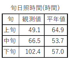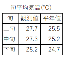 南から高気圧に覆われたが、27日に前線が通過後は、高気圧に覆われたが、周期的に北日本を低気圧が進み、気温の差も大きくなった。27日は寒冷前線が通過し、大気が不安定となり降水量が多くなった。最高気温の平均は8月下旬として、これまでで最も高くなりました。