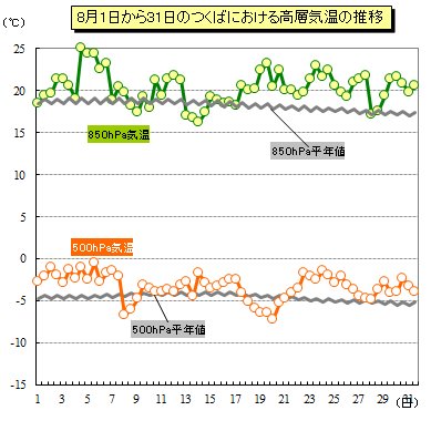 ●8月の日立市役所における日平均気温の推移とつくばにおける500hPaと850hPa気温の推移