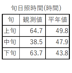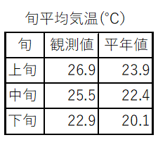 9月は、周期的に前線が通過し、晴れの日は多くなりましたが、雨が降る日も多くなりました。気温は平年よりかなり高く、降水量は雨の日が多い割には少なく平年の62パーセント。一方、日照時間は平年の118パーセントと多くなりました。