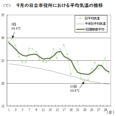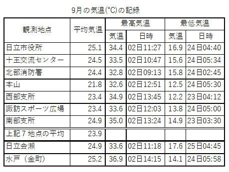 9月の日立市内の気温の観測結果を比較すると、平均気温は日立市役所が最も高くなっています。市内7地点の平均気温は23.9℃で、水戸の月平均気温25.2℃より低くなりました。