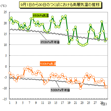 ●9月の日立市役所における日平均気温の推移とつくばにおける500hPaと850hPa気温の推移