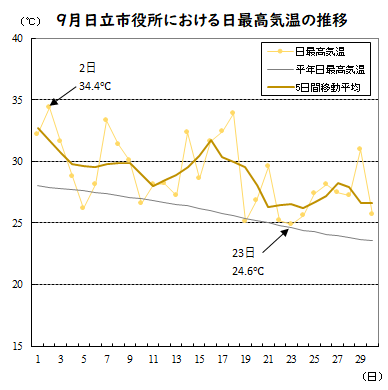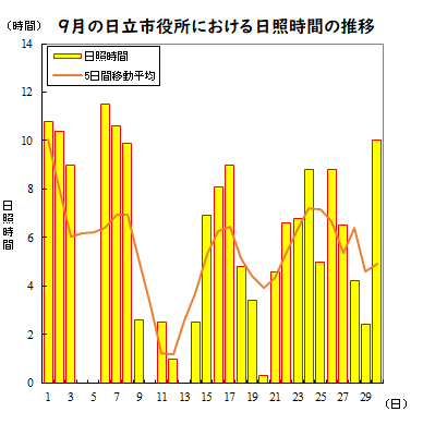 ●9月の日立市役所における日最高気温と日照時間の推移