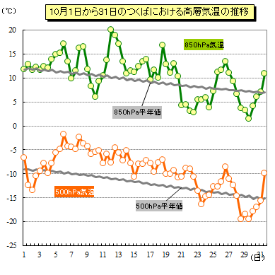 ●10月の日立市役所における日平均気温の推移とつくばにおける500hPaと850hPa気温の推移