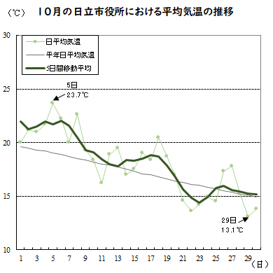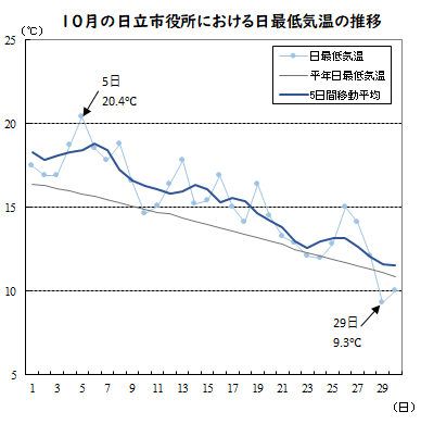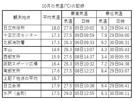10月の日立市内の気温の観測結果を比較すると、平均気温は日立市役所が最も高くなっています。市内7地点の平均気温は16.7℃で、水戸の月平均気温17.5℃より低くなりました。