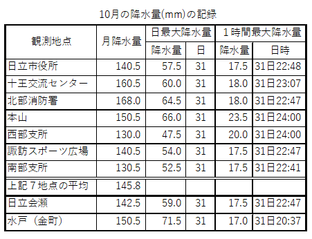 月の降水量の市内平均は145.8mmで、最も降水量が多かったのは北部消防署の168.0mm。最も少なかったのは西部支所の130.0mmと1.29倍の差があった。また、市内7地点の平均降水量145.8mmに対して、水戸の月降水量は150.5mmとやや多かった。