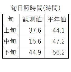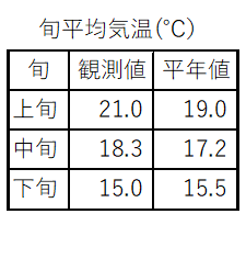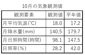 10月は、周期的天気が変わりましたが、南の海上に前線があることが多く、湿った空気が入りやすくなりました。雨や曇りの日が多く、晴れの日が少なくなりました。気温は平年より高く、降水量は少なく平年の78パーセント。日照時間も少なく、平年の67パーセントでした。