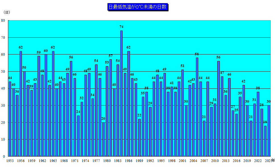 日最低気温が0℃未満(冬日)の日数の経年変化